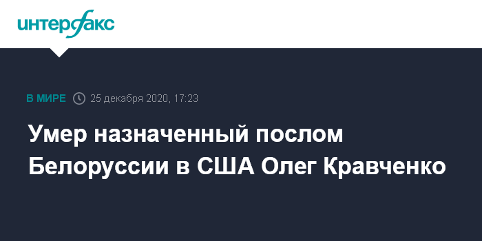 Москва. 25 декабря. INTERFAX.RU - В Белоруссии скоропостижно умер замминистра иностранных дел Олег Кравченко, в июле назначенный белорусским послом в США. Об этом сообщил пресс-секретарь министерства Анатолий Глаз.