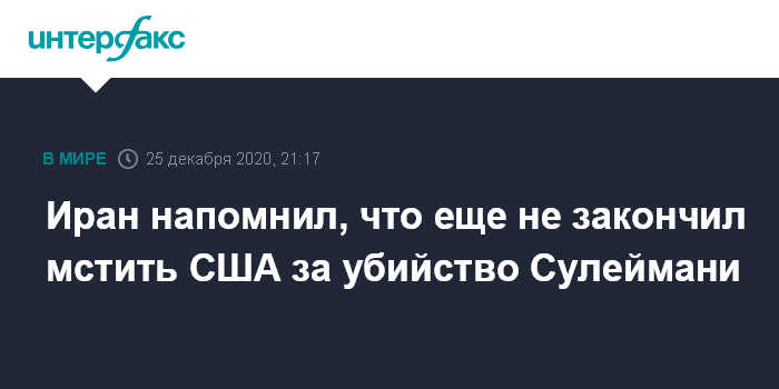 Москва. 25 декабря. INTERFAX.RU - Иран не считает завершенной месть США за убийство командующего спецподразделением "Кудс" Касема Сулеймани, заявил заместитель командира "Кудс" Корпуса Стражей Исламской Революции (КСИР) генерал Мохаммед Хеджази.
