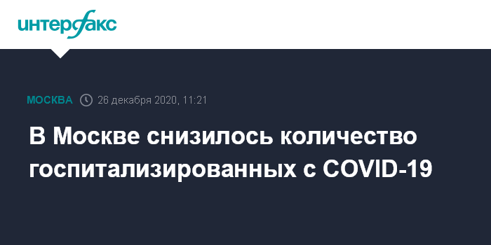 Москва. 26 декабря. INTERFAX.RU - Количество госпитализированных с COVID-19 в столичные клиники снизилось более чем на 100 человек по сравнению с прошлыми сутками, сообщили в оперативном штабе по контролю и мониторингу ситуации с коронавирусом в Москве в субботу.