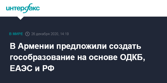 Москва. 26 декабря. INTERFAX.RU - В Армении руководитель центристской партии "Альянс" Тигран Уриханян предлагает обсудить вариант создания союзного государственного образования на основе ОДКБ, ЕАЭС и России.