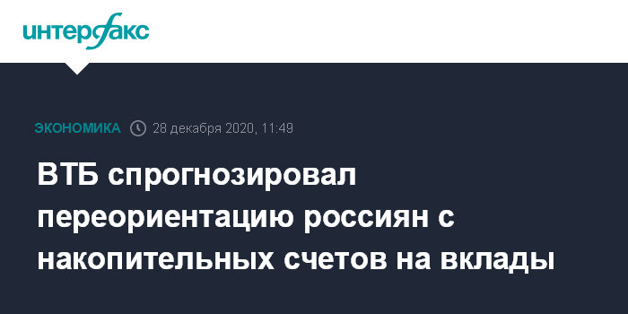 Москва. 28 декабря. INTERFAX.RU - Окончание второй волны пандемии, вакцинация и адаптация граждан и бизнеса к новым реалиям может привести к увеличению срока размещения денежных средств и постепенной переориентации россиян с накопительных счетов на вклады, считает начальник управления "Сбережения" ВТБ Максим Степочкин.