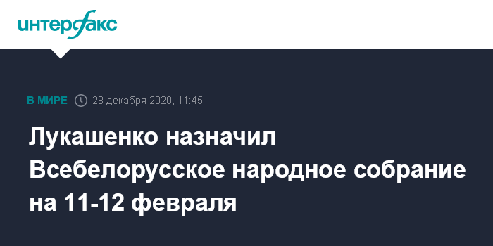 Москва. 28 декабря. INTERFAX.RU - Президент Белоруссии Александр Лукашенко заявил, что Всебелорусское народное собрание (ВНС) пройдет 11-12 февраля, сообщил близкий к его пресс-службе телеграм-канал "Пул первого". Он назвал эти даты на совещании по подготовке ВНС.