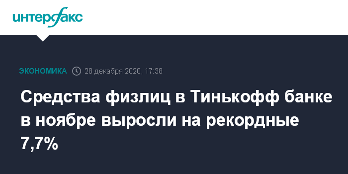 Средства физлиц в Тинькофф банке в ноябре выросли на рекордные 7,7%