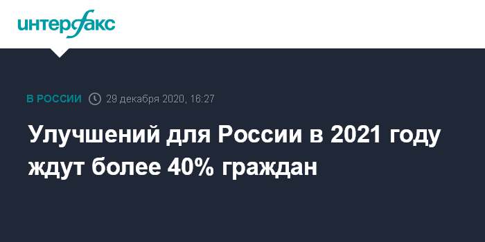 Москва. 29 декабря. INTERFAX.RU - Предстоящий 2021 год для России, по мнению 42% россиян, станет более удачным, среди респондентов в возрасте 60 лет и старше улучшений в жизни страны ждёт каждый второй (49%), свидетельствуют данные опроса ВЦИОМ, поступившие в "Интерфакс".