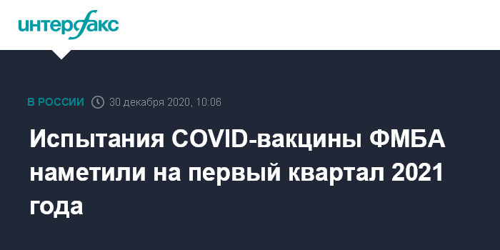 Москва. 30 декабря. INTERFAX.RU - Федеральное медико-биологическое агентство планирует приступить к клиническим исследованиям своей вакцины от COVID-19 в первом квартале 2021 года.
