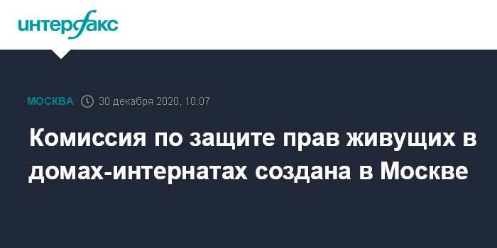 Москва. 30 декабря. INTERFAX.RU - В Москве создана комиссия по защите прав граждан, проживающих в домах-интернатах. Об этом сообщили в пресс-службе департамента труда и социальной защиты населения столицы.