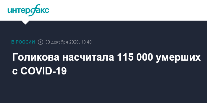 Москва. 30 декабря. INTERFAX.RU - В России 70 921 человек умер от коронавирусной инфекции, и еще 45 109 считаются умершими от других причин, но при этом перед смертью они получили положительный тест на COVID-19, заявила "России-24" вице-премьер Татьна Голикова.