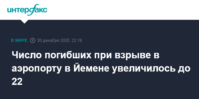 Москва. 30 декабря. INTERFAX.RU - Не менее 22 человек погибли в результате серии взрывов и обстрела аэропорта Адена на юго-западе Йемена, а еще 50 - получили ранения, сообщает в среду Associated Press (AP).