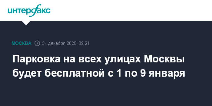 Москва. 31 декабря. INTERFAX.RU - С 1 по 9 января парковки на всех улицах Москвы будут работать бесплатно, включая те, на которых установлен максимальный тариф 380 рублей в час.