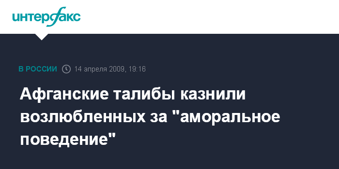 Дели. 14 апреля. INTERFAX.RU - Боевики движения "Талибан" в юго-западной афганской провинции Нимроз казнили молодую пару, пытавшуюся тайно сбежать из родной деревни, сообщает во вторник индийская газета "Таймс оф Индиа" со ссылкой на сообщение представителей местных властей.