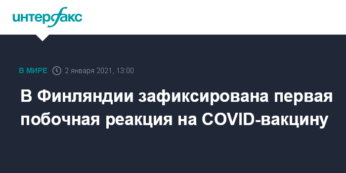 Москва. 2 января. INTERFAX.RU - В Агентство по безопасности и развитию в области фармацевтики Fimea (Финляндия) поступила первая заявка о побочной реакции на вакцину от коронавируса.