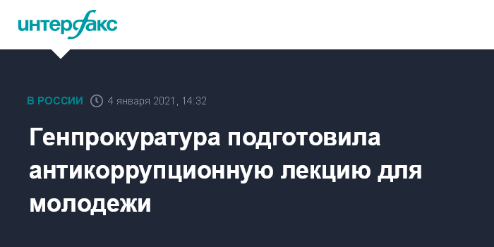 Москва. 4 января. INTERFAX.RU - Генпрокуратура России подготовила лекцию для детей и молодежи о вреде коррупции, как явлении, разлагающем общество и государство. Материал должен использоваться в качестве методической помощи работникам просвещения.