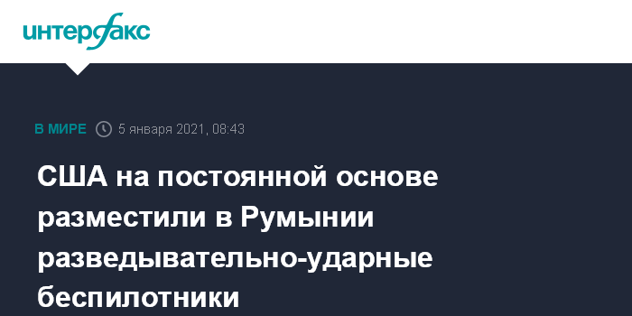 Москва. 5 января. INTERFAX.RU - Соединенные Штаты на постоянной основе разместили на авиабазе Кымпия-Турзий в Румынии эскадрилью разведывательно-ударных беспилотников MQ-9 Reaper, сообщило Командование ВВС США в Европе и Африке.