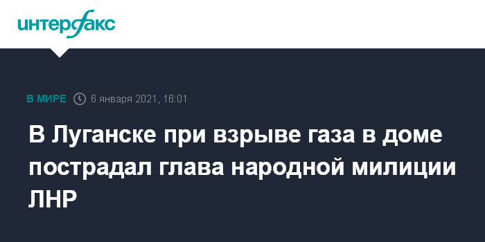 Москва. 6 января. INTERFAX.RU - Глава народной милиции самопровозглашенной Луганской народной республики Ян Лещенко госпитализирован с ожогами после взрыва в жилом доме в Луганске, сообщил "Интерфаксу" информированный источник в среду.