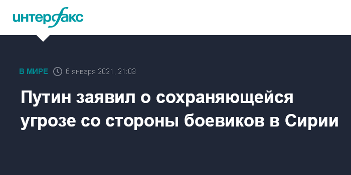Москва. 6 января. INTERFAX.RU - Террористическая угроза со стороны бандформирований в Сирии исходит до сих пор, заявил президент РФ Владимир Путин.