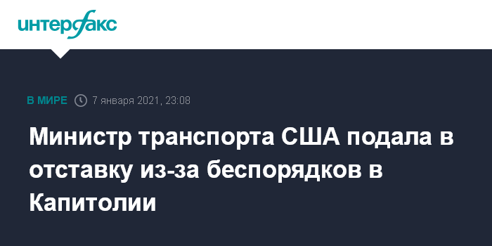 Москва. 7 января. INTERFAX.RU - Министр транспорта США Элейн Чао подает в отставку из-за произошедших накануне протестов в Капитолии во время сертификации голосов выборщиков, говорится в ее заявлении в твиттере.