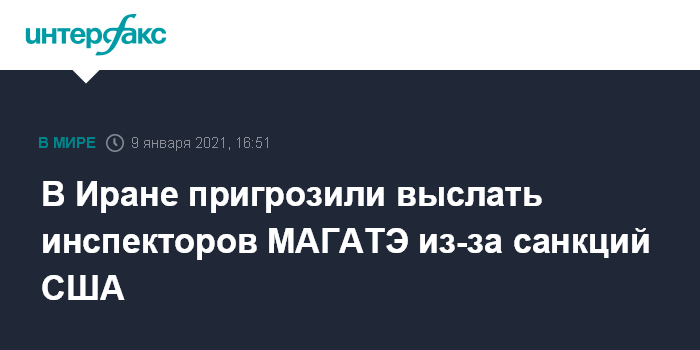 Москва. 9 января. INTERFAX.RU - Тегеран вышлет из страны инспекторов Международного агентства по атомной энергии (МАГАТЭ) 21 февраля, если до этого срока не прекратят действовать санкции США против Ирана, заявил в субботу член президиума иранского парламента Ахмад Амирабади.