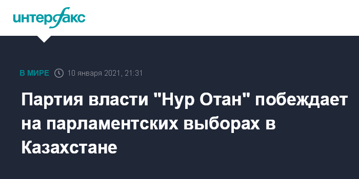 Москва. 10 января. INTERFAX.RU -Партия власти "Нур Отан" (Nur Otan) получает большинство в мажилисе (нижней палате парламента Казахстана), набрав на выборах 71,97% голосов избирателей, свидетельствуют данные опроса избирателей на выходе с участков, проведенного исследовательским институтом "Когамдык пикир" ("Общественное мнение") по заказу портала Zakon.kz.
