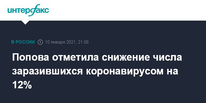 Москва. 10 января. INTERFAX.RU - С начала 2021 года количество случаев заражения коронавирусом COVID-19 снизилось на 12%, но о стабилизации ситуации с распространением коронавируса в России говорить рано, заявила глава Роспотребнадзора Анна Попова.