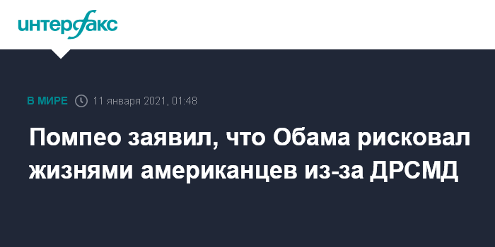 Москва. 11 января. INTERFAX.RU - Бывший президент США Барак Обама рисковал жизнями граждан Соединенных Штатов, выполняя обязательства по договору о ликвидации ракет средней и меньшей дальности (ДРСМД), считает госсекретарь Майк Помпео.