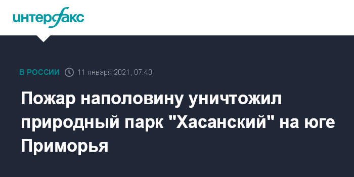 Москва. 11 января. INTERFAX.RU - Пожарные потушили огонь на особо охраняемой территории природного парка "Хасанский" в Приморье на границе с Китаем и КНДР, сгорело более 4 тысяч гектаров. Амурская бассейновая природоохранная прокуратура проводит проверку.