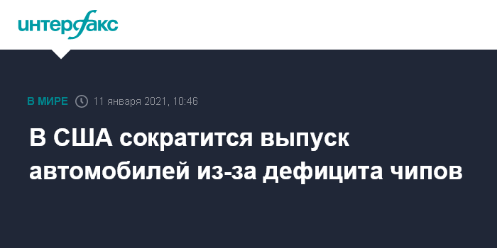 Москва. 11 января. INTERFAX.RU - Дефицит микросхем, уже затронувший автопроизводство в разных регионах мира, теперь отразится и на выпуске автомобилей в США, пишет The Wall Street Journal.