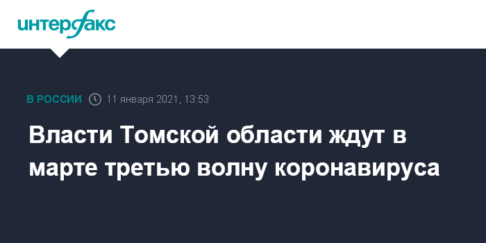 Москва. 11 января. INTERFAX.RU - Власти Томской области, ссылаясь на прогнозы специалистов, ожидают, что в регионе в марте начнется третья волна коронавируса. Об этом в телеграм-канале обладминистрации сообщил вице-губернатор региона Иван Деев.