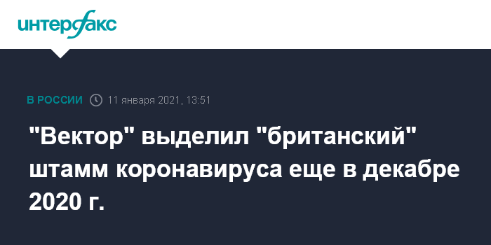 Москва. 11 января. INTERFAX.RU - Научный центр "Вектор" Роспотребнадзора выделил "британский" штамм коронавируса из материала пациента еще в декабре 2020 года, проводится изучение материала, сообщили в пресс-службе Роспотребнадзора в понедельник.