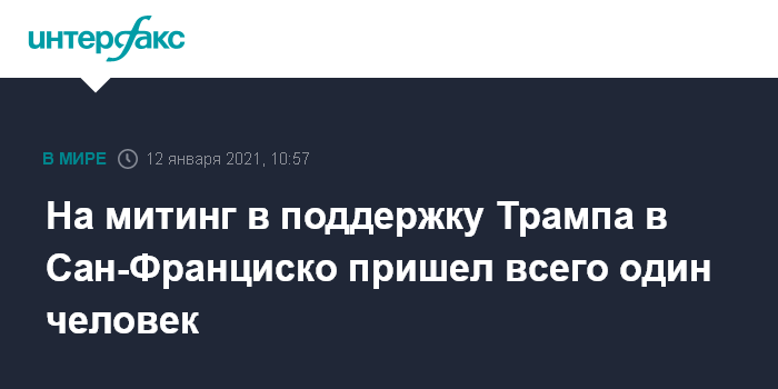 Москва. 12 января. INTERFAX.RU - У штаб-квартиры Twitter в Сан-Франциско накануне, 11 января, прошел митинг в поддержку действующего президента США Дональда Трампа и против решения этой компании о блокировке аккаунта американского лидера в сети микроблогов, однако акция получилась немногочисленной - на нее пришел всего один человек, пишет сайт The Verge.