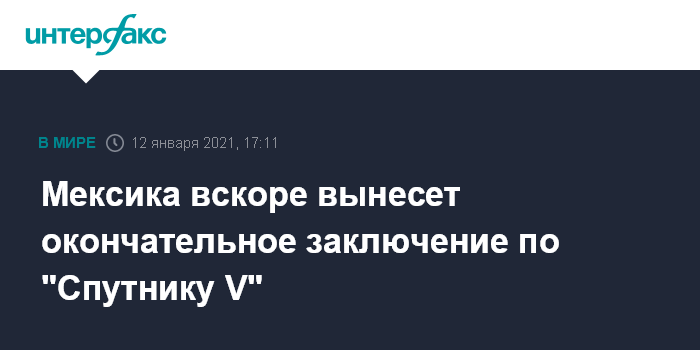 Москва. 12 января. INTERFAX.RU - Мексика в ближайшее время намерена вынести окончательное заключение по применению российской вакцины против COVID-19 "Спутник V", сообщил во вторник заместитель министра здравоохранения страны Уго Лопес-Гатель на пресс-конференции, которая транслировалась в эфире мексиканского телевидения.