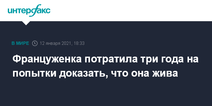 Москва. 12 января. INTERFAX.RU - Француженка Жанна Пушен три года доказывала, что она жива, после того как суд официально признал ее умершей.