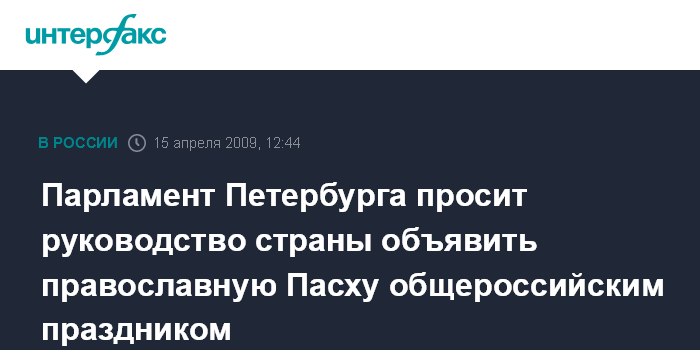 Москва. 15 апреля. INTERFAX.RU - Законодательное собрание Петербурга на заседании в среду приняло обращение к президенту РФ Дмитрию Медведеву, в котором просит придать празднованию православной Пасхи общероссийский статус.