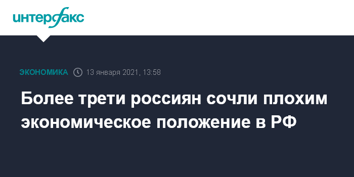 Москва. 13 января. INTERFAX.RU - Текущую экономическую ситуацию в России, как плохую, оценивают 36% сограждан, свидетельствуют данные опроса ВЦИОМ, поступившие в среду в "Интерфакс".