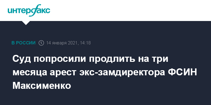 Москва. 14 января. INTERFAX.RU - Следователь попросил Басманный суд продлить до 25 апреля арест бывшему замдиректора ФСИН Валерию Максименко, сообщила пресс-секретарь суда Ирина Софинская.