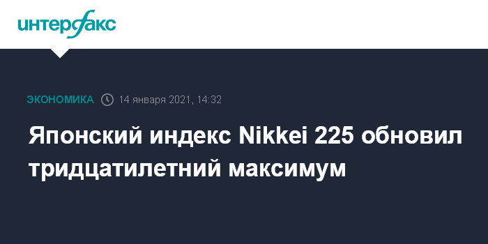 Москва. 14 января. INTERFAX.RU - По итогам торгов четверга японский биржевой индекс Nikkei 225 увеличился на 0,85%. Подъем индекса продолжается уже пятую сессию подряд, в результате индикатор в очередной раз обновил максимум за последние 30 лет.