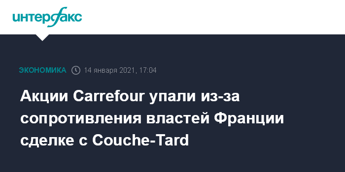 Москва. 14 января. INTERFAX.RU - Акции французского владельца супермаркетов Carrefour SA дешевеют на торгах в четверг на новостях о том, что власти Франции выступают против сделки по объединению компании с канадским ритейлером Alimentation Couche-Tard Inc.