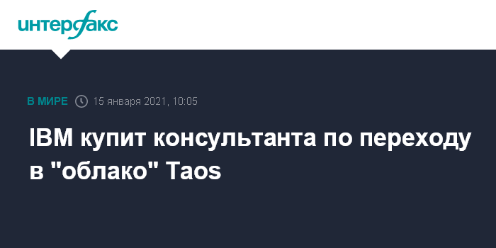 Москва. 15 января. INTERFAX.RU - Корпорация International Business Machines (IBM) купит компанию Taos Mountain LLC, оказывающую бизнесу услуги перевода IT-инфраструктуры в "облако". Сделка должна быть закрыта в I квартале 2021 года. Ее сумма не раскрывается.