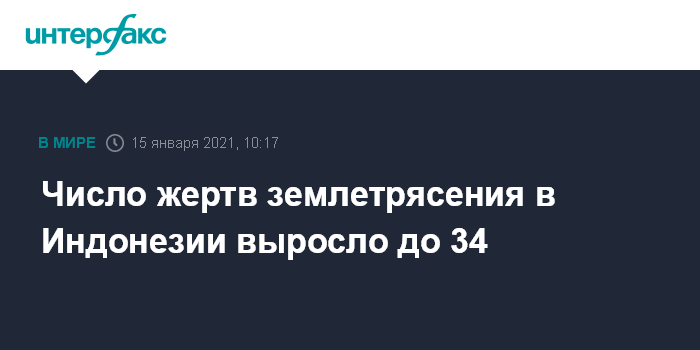 Москва. 15 января. INTERFAX.RU - В Индонезии в результате землетрясения на острове Сулавеси нашли уже 34 погибших, пишет Guardian. Только в городе Мамуджу погибли 26 человек, сказал журналистам руководитель местного агентства по ликвидации последствий стихийных бедствий Али Рахман. Ранее СМИ сообщали о семи погибших.