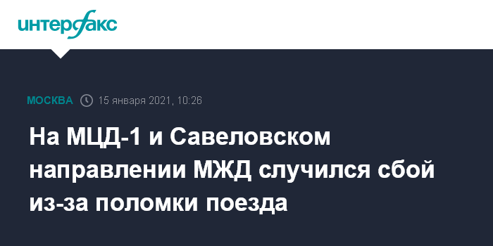 Москва. 15 января. INTERFAX.RU - Утром в пятницу поезда Белорусско-Савеловского диаметра (МЦД-1) и Савеловского направления Московской железной дороги ходят с увеличенными интервалами, сообщили в департаменте транспорта Москвы.