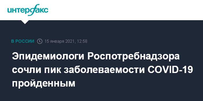 Москва. 15 января. INTERFAX.RU - Пик заболеваемости коронавирусом в РФ, вероятно, пройден, есть тенденция к стабилизации ситуации, сообщила заместитель директора по клинико-аналитической работе Центрального научно-исследовательского института эпидемиологии Роспотребнадзора Наталья Пшеничная.