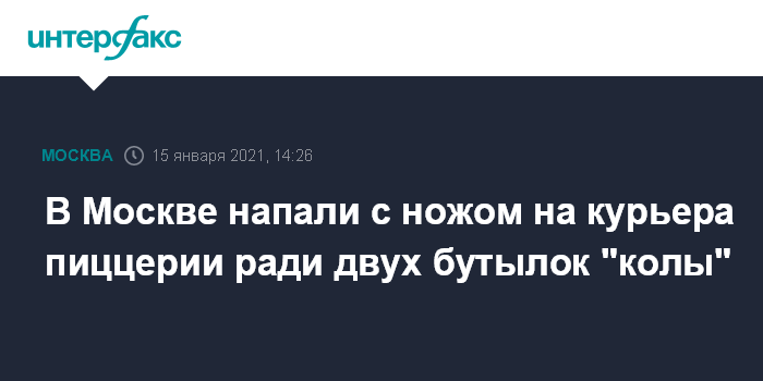 Москва. 15 января. INTERFAX.RU - Полицейские задержали на западе Москвы двух подозреваемых в нападении с ножом на курьера ради двух бутылок "колы", сообщил "Интерфаксу" в пятницу информированный источник.