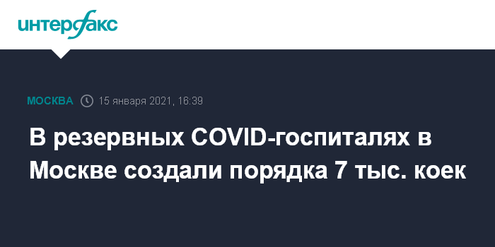 Москва. 15 января. INTERFAX.RU - В настоящее время в резервных госпиталях, созданных для борьбы с коронавирусом, работает порядка 7 тыс. коек, сообщила заммэра по вопросам социального развития столицы Анастасия Ракова в ходе Гайдаровского форума в пятницу.