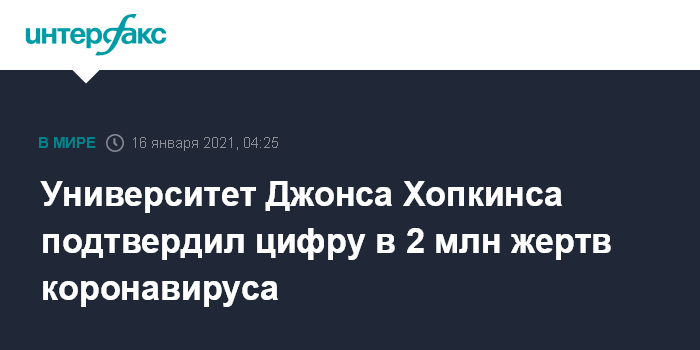 Москва. 16 января. INTERFAX.RU - С начала пандемии COVID-19 в мире число скончавшихся от вызываемых коронавирусом заболеваний, по состоянию на 3:00 субботы по московскому времени, достигло 2 006 611, сообщил американский университет Джонса Хопкинса.
