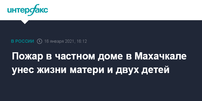 Москва. 16 января. INTERFAX.RU - Женщина и двое малолетних детей погибли, еще один ребенок пострадал во время пожара в частном доме в столице Дагестана Махачкале, сообщил "Интерфаксу" в субботу информированный источник.