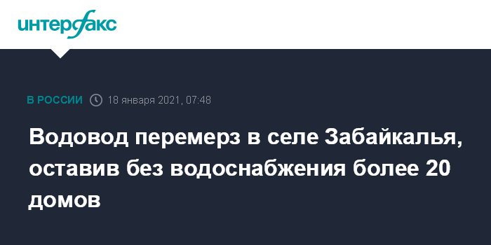 Москва. 18 января. INTERFAX.RU -Авария на водоводе оставила без центрального водоснабжения 23 жилых дома, а также ряд социальных и коммунальных объектов, в селе Верх-Усугли Забайкальского края, сообщает пресс-служба правительства региона.