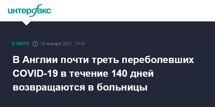Москва. 18 января. INTERFAX.RU - В Англии 29,4% тех, кто переболел COVID-19 в больнице, в течение в среднем 140 суток после выздоровления возвращались в стационар с обострением других заболеваний, а 12,3% из них умерли. Об этом сообщает Sky News со ссылкой на исследование Национальной статистической службы, Университетского колледжа Лондона и Лестерского университета
