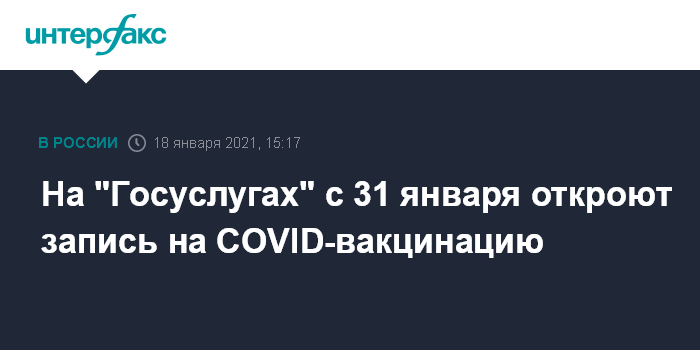 Москва. 18 января. INTERFAX.RU - На интернет-портале "Госуслуги" и в соответствующем мобильном приложении в тестовом режиме стартовала запись на вакцинацию против COVID-19, все желающие смогут записаться на вакцинацию в конце января, сообщил в понедельник вице-премьер РФ Дмитрий Чернышенко.