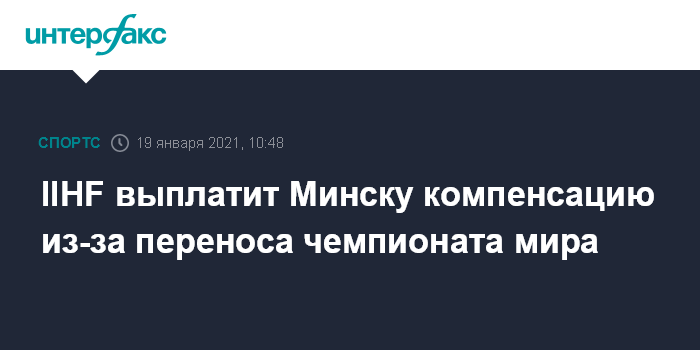 Москва. 19 января. INTERFAX.RU - Международная федерация хоккея (IIHF) в связи с отменой проведения чемпионата мира по хоккею в Минске должна будет выплатить Белоруссии компенсацию.