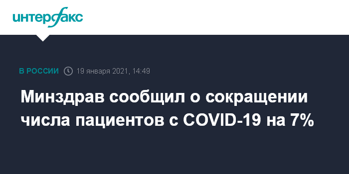 Москва. 19 января. INTERFAX.RU - В России число пациентов с коронавирусной инфекцией, которые лечатся в больницах и амбулаторно, снизилось на 6,6%, всего их пока чуть больше 1 млн человек, заявил глава Минздрава Михаил Мурашко на заседании президиума координационного совета при правительстве.