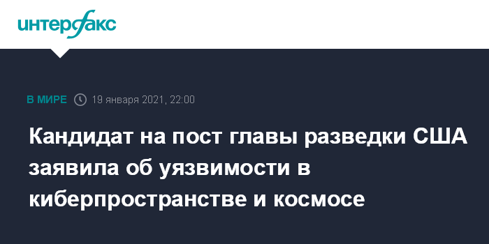 Москва. 19 января. INTERFAX.RU - США сильно зависят от находящихся на орбите спутников, а также от работы в киберпространстве, и потому очень уязвимы там, заявила кандидат на пост директора Национальной разведки США Аврил Хейнс.